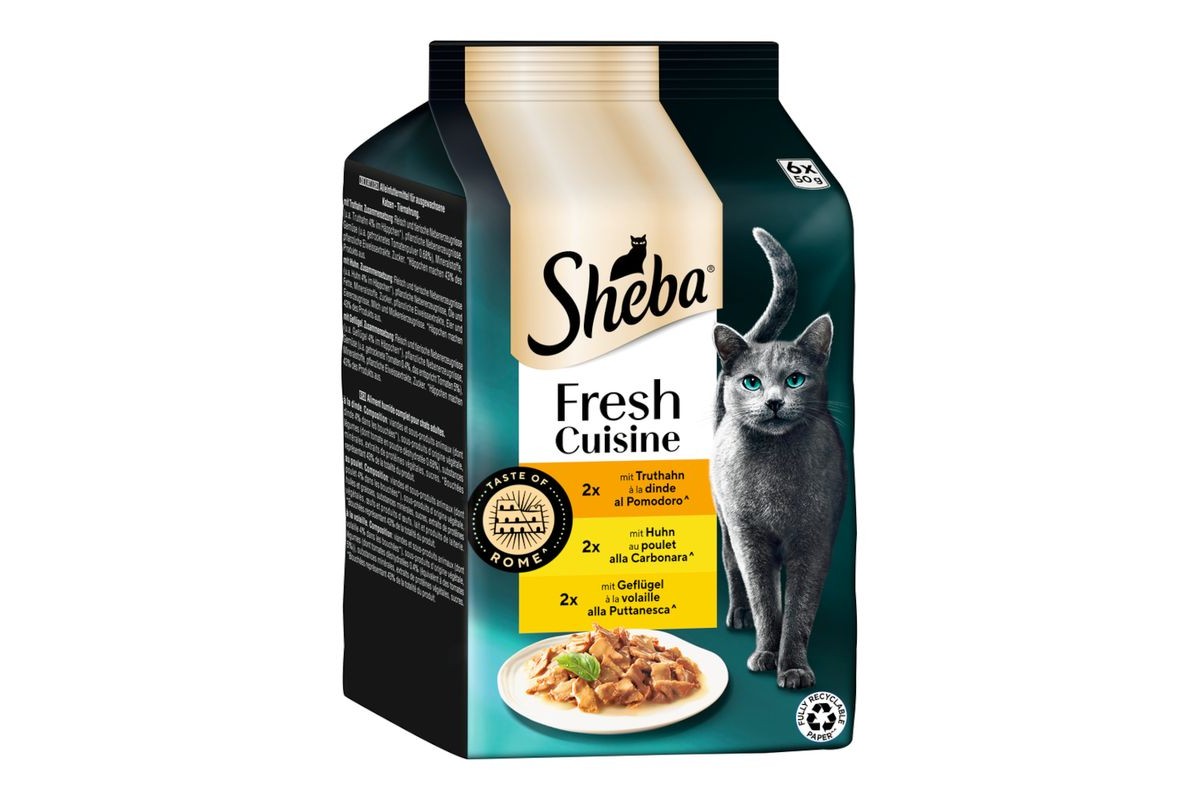 A Sheba Fresh Cuisine Taste of Rome három pompás fajtát tartalmaz: csirke, pulyka és szárnyas finom szószban. Az összetételt a felnőtt macskák szükségleteihez igazították. A Sheba nedvestáp állatorvosokkal együttműködésben került kifejlesztésre, és nagy gonddal állítják elő. Ellátja kedvencét minden fontos tápanyaggal.