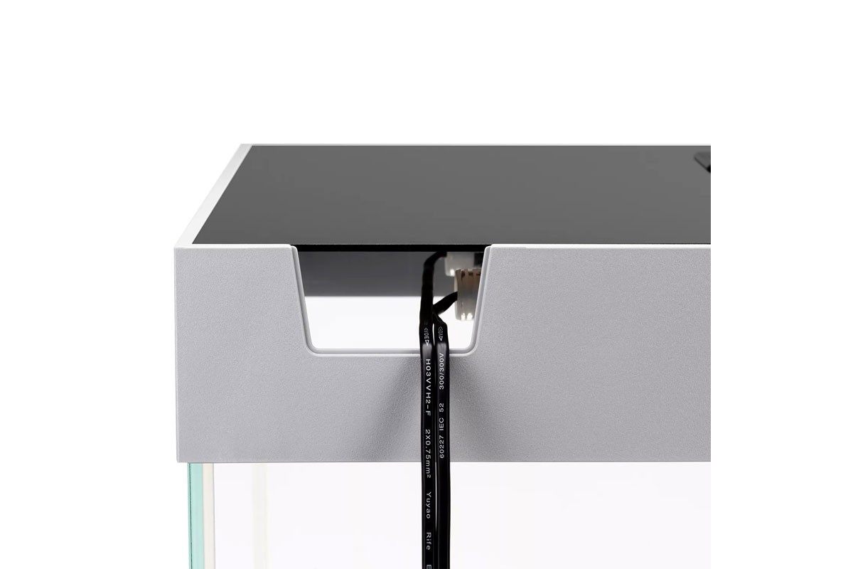 A keret tökéletesen illeszkedik az elegáns fedélhez is, amely a szabadalmaztatott Smart Open rendszerrel van ellátva, amely lehetővé teszi, hogy könnyen kinyitható és a kívánt pozícióban tartható legyen. A fedél egy zárható ablakot is tartalmaz, amelyet a halak kényelmes etetésére terveztek. Az akvárium hátsó falán található műszaki nyílások a külső szűrőtömlők és az akvárium elektromos berendezéseinek áramellátásához használt vezetékek számára szolgálnak.