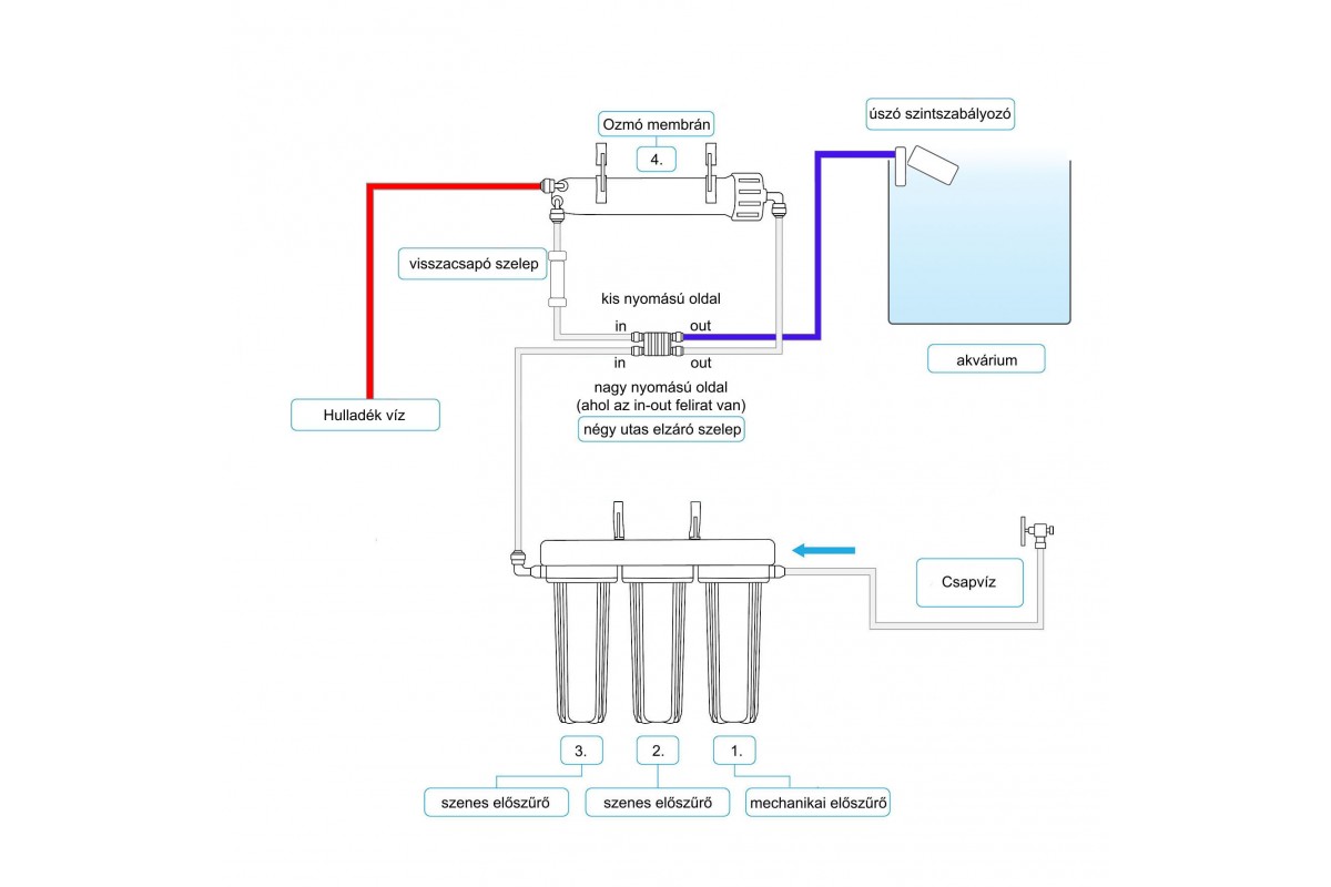 Majd a magas nyomás az "out" nyílásból a membrán ház bemenő nyílásához megy. - A RO membránház alacsony nyomás kimenő nyílása (vagyis a "jó" víz) kapcsolódik a szelep "in" részéhez.