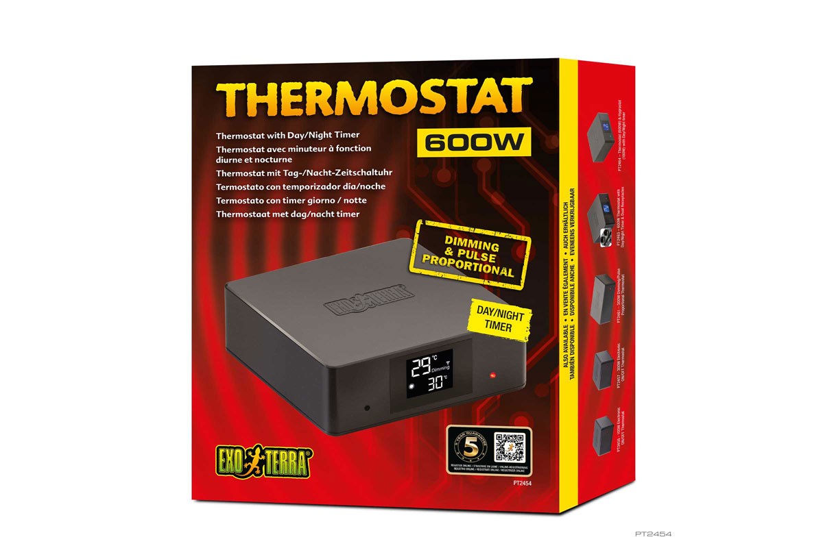 A hüllők ectotherm-ek, és külső forrásból származó hőt használnak az optimális testhőmérsékletük hőszabályozásához. A legtöbb hüllő a nap közvetlen sugárzó hőjét használja a napfűtötte felületek, például ágak, sziklák vagy más hőtároló szerkezetek vezetőképes hőjével kombinálva. A terráriumban a megfelelő, a fajnak megfelelő hőmérséklet-gradiens biztosítása fontos tényező a sikeres hüllőtartás szempontjából. Az Exo Terra 600W-os termosztáttal nappali/éjszakai időzítővel egy jól szabályozható, 24 órás fűtési rendszert hozhat létre, amely lehetővé teszi a sivatagi vagy trópusi környezethez hasonló, szükséges hőmérsékleti viszonyok fenntartását.