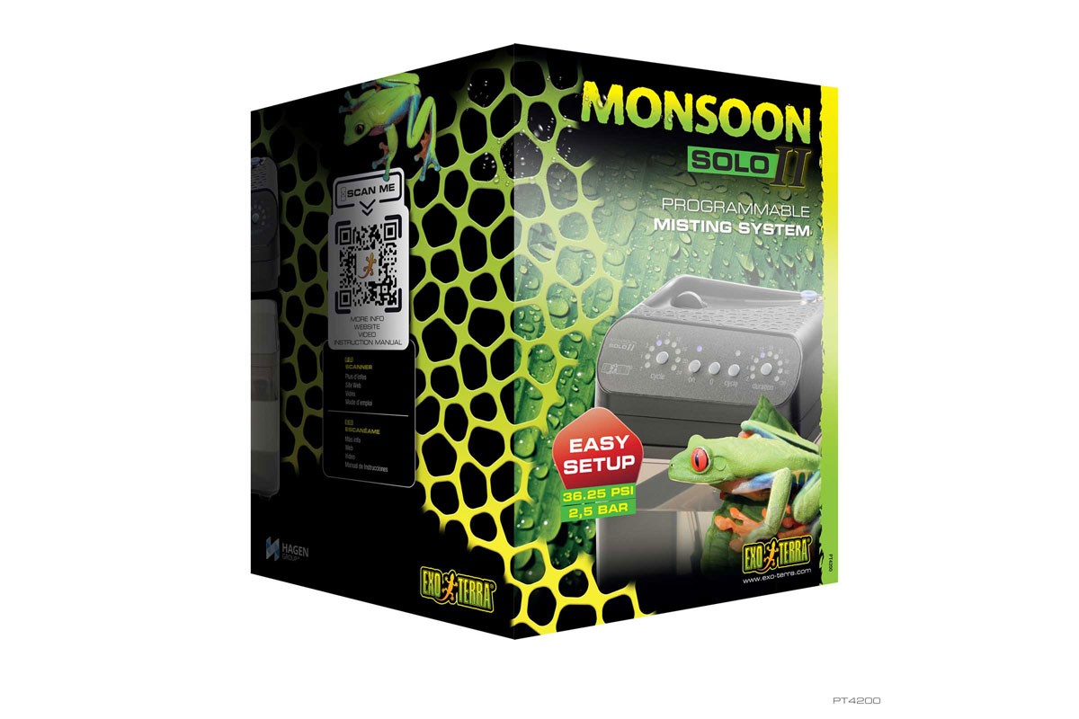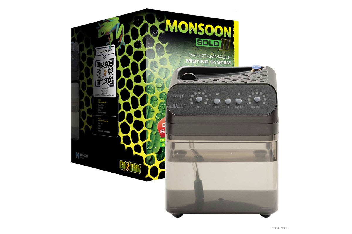 Az Exo Terra® Monsoon SOLO II egy programozható ködképző rendszer, amely minden típusú terráriumhoz és üvegházhoz alkalmas. Segít fenntartani az optimális páratartalmat azáltal, hogy programozott időközönként finom ködöt termel, amelynek időtartama és gyakorisága könnyen beállítható a tartott állat vagy növény típusától függően. A gyakori ködképzés segít a szaporodási viselkedés ösztönzésében, és elengedhetetlen az élő trópusi növények, például broméliák, orchideák, mohák stb. tartásakor.