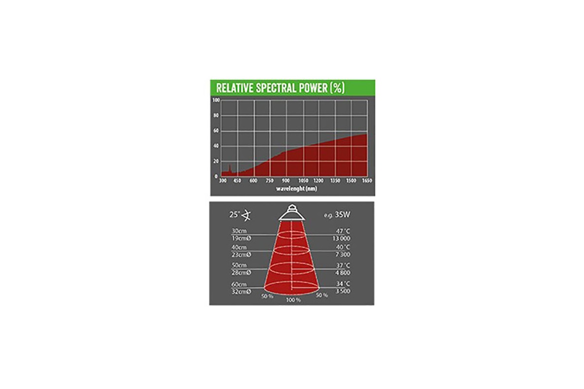 A halogén izzó alacsonyabb energiafogyasztás mellett nagyobb fény- és hőintenzitást biztosít (lehetőség van alacsonyabb teljesítményű izzó választására). A speciális alumínium reflektor helyi fűtési pontot hoz létre. Az izzó kiválasztásakor nemcsak az izzó típusát, hanem a tenyésztendő állatfajokat és az állat és a hősugárzás forrása közötti távolságot is figyelembe kell venni. A lámpákra és fénycsövekre a szokásos jótállási idő vonatkozik. Ez azonban nem vonatkozik a fényvezetők törésére, a csövek törésére és a gázszivárgásra, amelyek normál használat során keletkeznek (a szokásos élettartam körülbelül 6 hónap). A jótállási idő az egyes államokban eltérő lehet, és a helyi törvények és előírások hatálya alá tartozik.