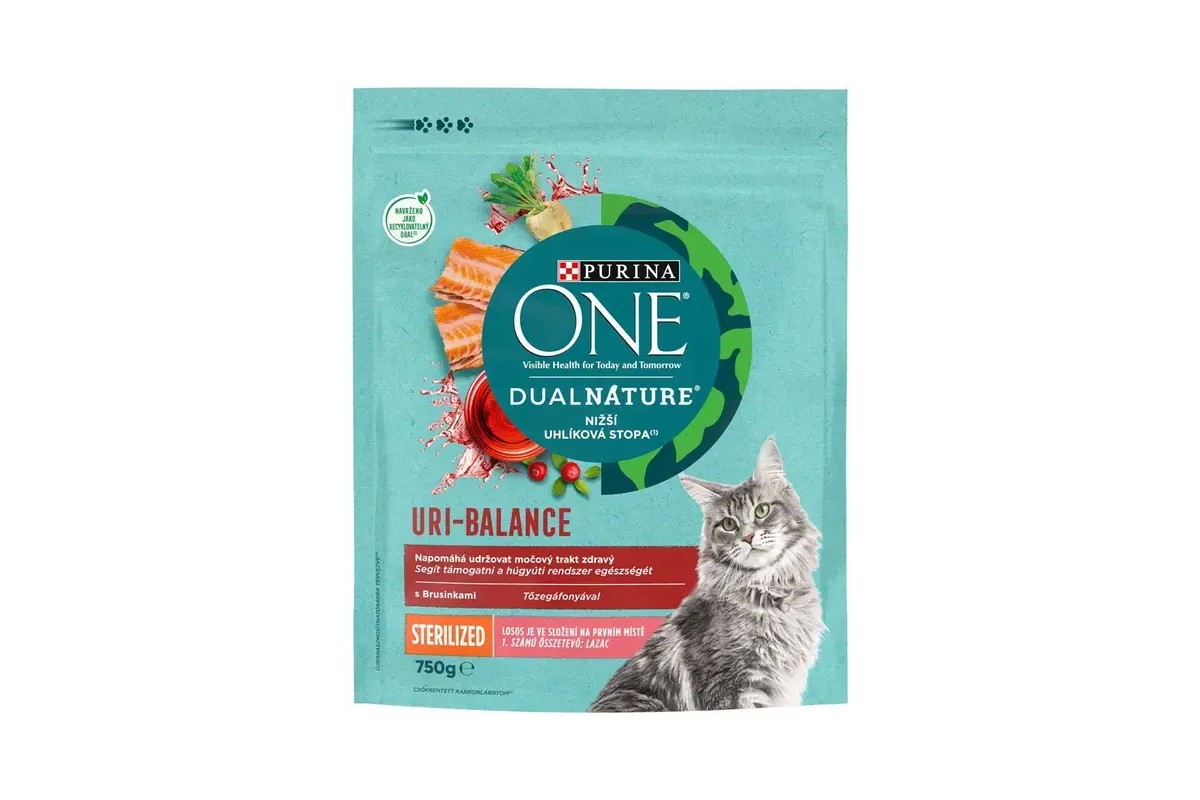 A Purina ONE DualNature Sterilcat Tőzegáfonyával Lazacban gazdag száraz macskaeledel ivartalanított macskák részére lett kifejlesztve: tőzegáfonyát tartalmaz és különböző állagú tápszemcsék izgalmas kombinációjában kapható.