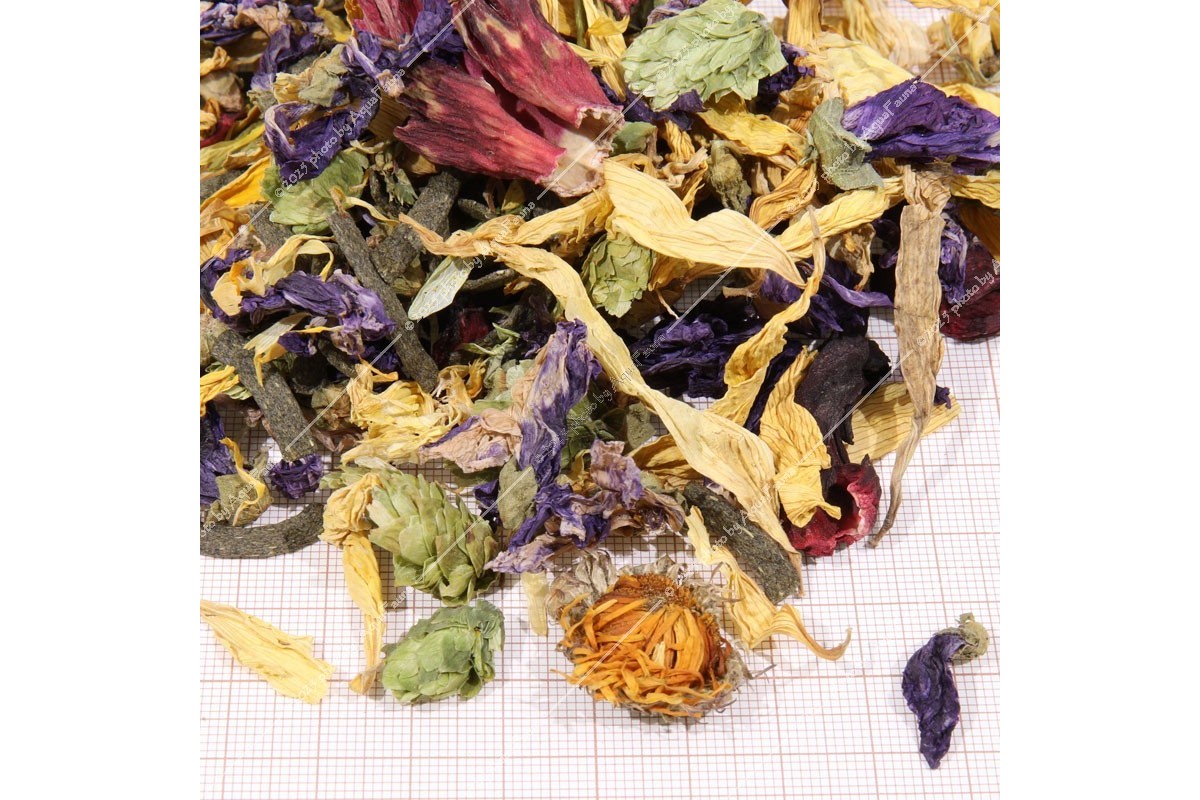 hibiszkusz virágok, körömvirág virágok, napraforgó szirmok, mályva virágai, komlóvirágok, lucerna liszt, búzacsíra-liszt, spenótliszt, szárított cukorrépapép, alma rost, búzadara, rozmaring, kakukkfű, bazsalikom