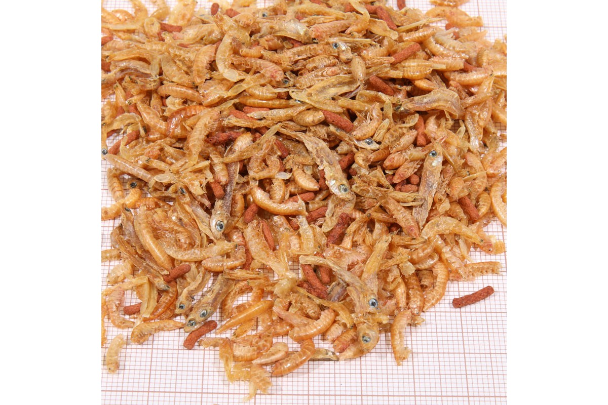 A csomag tartalma: fényálló doboz, frissességét megőrző zárással, szárított garnélákkal, apró halakkal, gammarusszal és rudakkal. Adagoló segédeszköz a fedélben