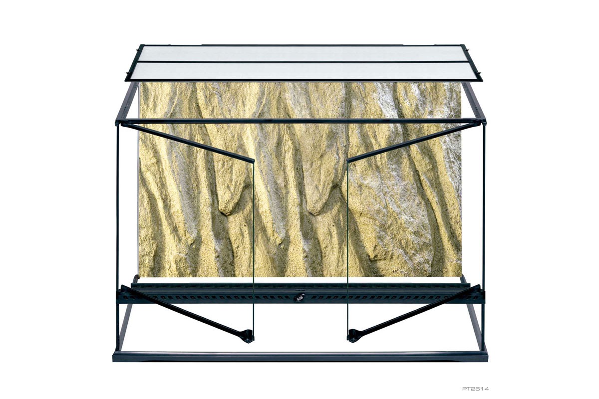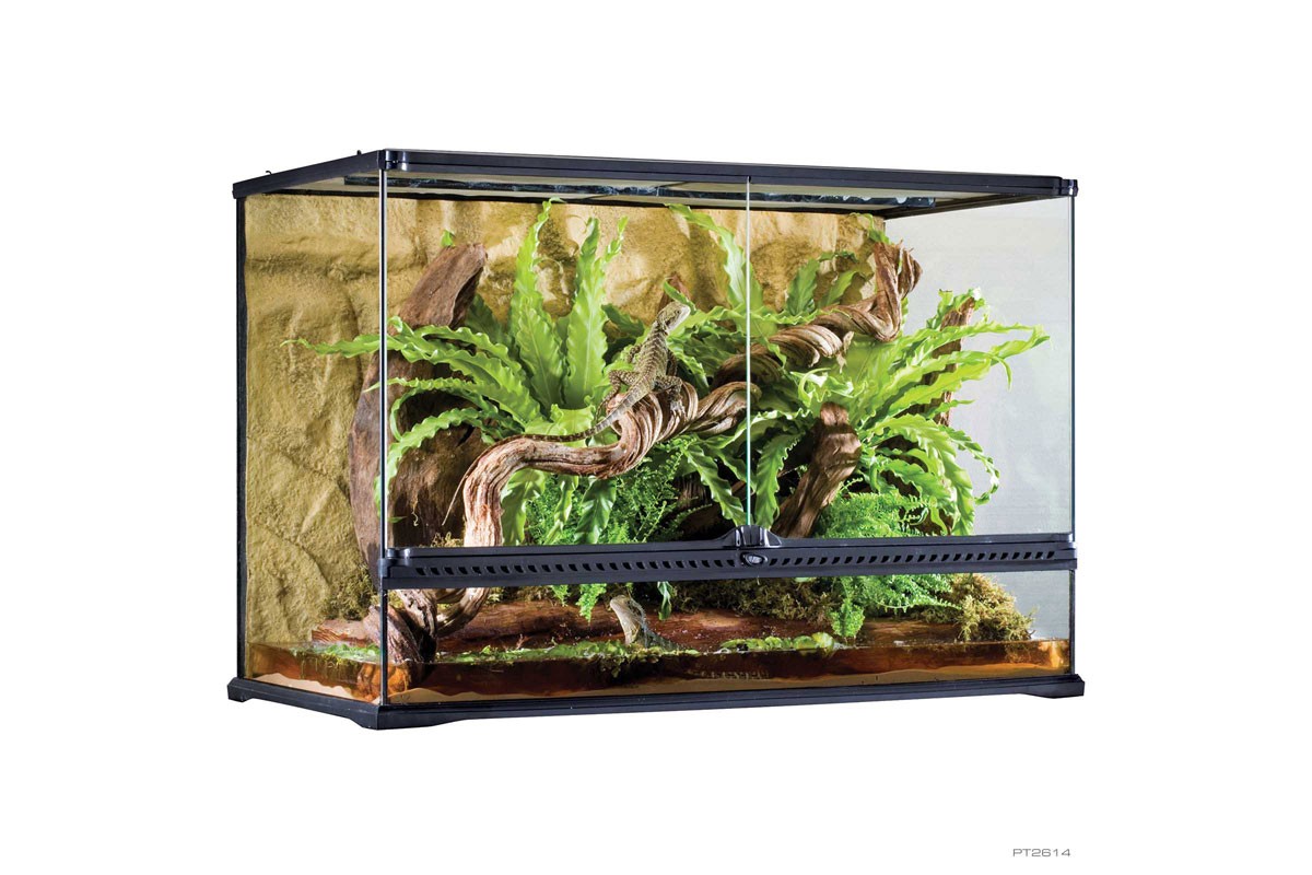 Az Exo Terra üveg terrárium az ideális hüllő- vagy kétéltűház, amelyet európai herpetológusok terveztek. Az elülső nyíló ajtók könnyű hozzáférést biztosítanak karbantartás és etetés céljából. Egy speciálisan kialakított zár megakadályozza a szökést, az ajtók pedig külön-külön is nyithatók. A teljes szúnyoghálós felső szellőzés lehetővé teszi az UVB és infravörös sugarak áthatolását, és teljesen levehető a könnyű hozzáférés érdekében dekoráció vagy tisztítás közben. A szúnyogháló hátulján mindkét oldalon 5 zárható vezeték- vagy csőbemenet található, amelyekkel hőhullám-köveket, vízeséseket, érzékelőket stb. lehet elhelyezni a terrárium belsejében. A terrárium alsó lapja meg van emelve, hogy egy aljzatfűtőt lehessen felszerelni a kiterjesztett talajfelület egy részének melegítésére. Az extra magas, fix elülső ablak ideális vastag aljzatrétegekhez (üregi hüllők), vízi élőhelyekhez (paludárium) vagy egy Exo Terra hüllőodú felszereléséhez. A természetes háttér színe megegyezik sok más Exo Terra dekorációs elem színével (víztálak, vízesések, hőhullám-kövek stb.), és extra mászóhatást biztosít.