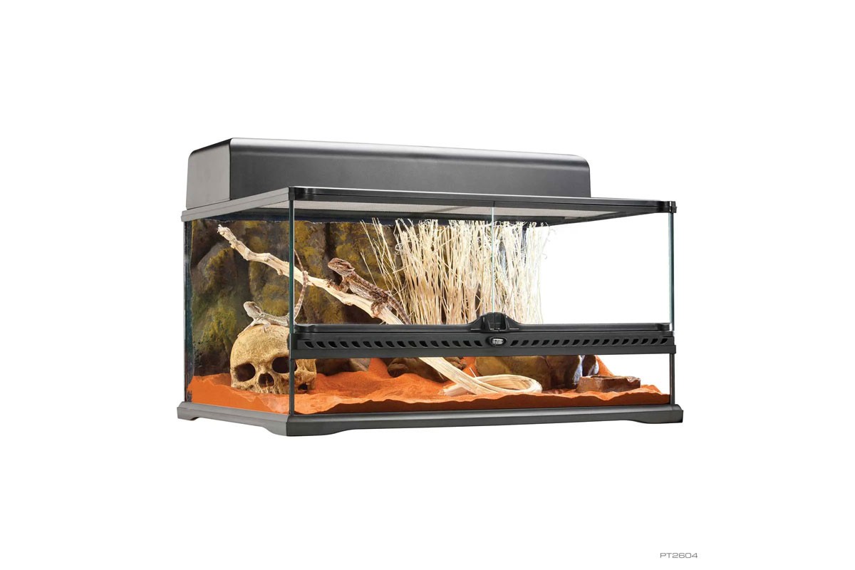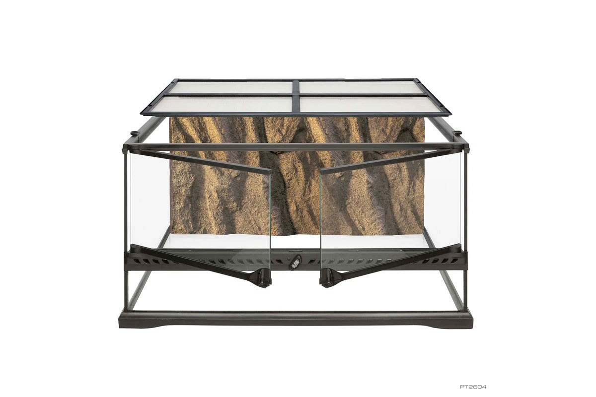 Az Exo Terra üveg terrárium az ideális hüllő- vagy kétéltűház, amelyet európai herpetológusok terveztek. Az elülső nyíló ajtók könnyű hozzáférést biztosítanak karbantartás és etetés céljából. Egy speciálisan kialakított zár megakadályozza a szökést, az ajtók pedig külön-külön is nyithatók. A teljes szúnyoghálós felső szellőzés lehetővé teszi az UVB és infravörös sugarak áthatolását, és teljesen levehető a könnyű hozzáférés érdekében dekoráció vagy tisztítás közben. A szúnyogháló hátulján mindkét oldalon 5 zárható vezeték- vagy csőbemenet található, amelyekkel hőhullám-köveket, vízeséseket, érzékelőket stb. lehet elhelyezni a terrárium belsejében. A terrárium alsó lapja meg van emelve, hogy egy aljzatfűtőt lehessen felszerelni a kiterjesztett talajfelület egy részének melegítésére. Az extra magas, fix elülső ablak ideális vastag aljzatrétegekhez (üregi hüllők), vízi élőhelyekhez (paludárium) vagy egy Exo Terra hüllőodú felszereléséhez. A természetes háttér színe megegyezik sok más Exo Terra dekorációs elem színével (víztálak, vízesések, hőhullám-kövek stb.), és extra mászóhatást biztosít.