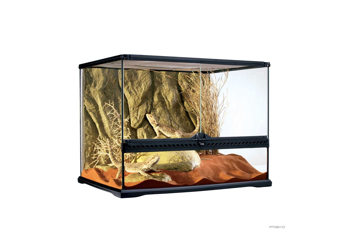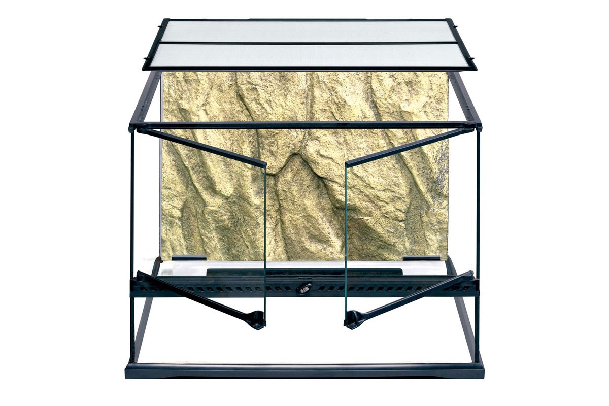 Az Exo Terra üveg terrárium az ideális hüllő- vagy kétéltűház, amelyet európai herpetológusok terveztek. Az elülső nyíló ajtók könnyű hozzáférést biztosítanak karbantartás és etetés céljából. Egy speciálisan kialakított zár megakadályozza a szökést, az ajtók pedig külön-külön is nyithatók. A teljes szúnyoghálós felső szellőzés lehetővé teszi az UVB és infravörös sugarak áthatolását, és teljesen levehető a könnyű hozzáférés érdekében dekoráció vagy tisztítás közben. A szúnyogháló hátulján mindkét oldalon 5 zárható vezeték- vagy csőbemenet található, amelyekkel hőhullám-köveket, vízeséseket, érzékelőket stb. lehet elhelyezni a terrárium belsejében. A terrárium alsó lapja meg van emelve, hogy egy aljzatfűtőt lehessen felszerelni a kiterjesztett talajfelület egy részének melegítésére. Az extra magas, fix elülső ablak ideális vastag aljzatrétegekhez (üregi hüllők), vízi élőhelyekhez (paludárium) vagy egy Exo Terra hüllőodú felszereléséhez. A természetes háttér színe megegyezik sok más Exo Terra dekorációs elem színével (víztálak, vízesések, hőhullám-kövek stb.), és extra mászóhatást biztosít.