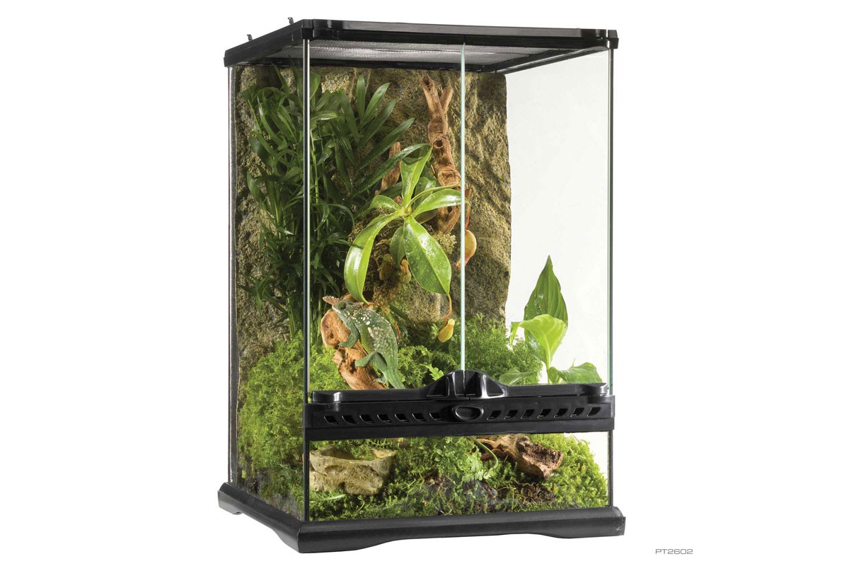 Az Exo Terra üveg terrárium az ideális hüllő- vagy kétéltűház, amelyet európai herpetológusok terveztek. Az elülső nyíló ajtók könnyű hozzáférést biztosítanak karbantartás és etetés céljából. Egy speciálisan kialakított zár megakadályozza a szökést, az ajtók pedig külön-külön is nyithatók. A teljes szúnyoghálós felső szellőzés lehetővé teszi az UVB és infravörös sugarak áthatolását, és teljesen levehető a könnyű hozzáférés érdekében dekoráció vagy tisztítás közben. A szúnyogháló hátulján mindkét oldalon 5 zárható vezeték- vagy csőbemenet található, amelyekkel hőhullám-köveket, vízeséseket, érzékelőket stb. lehet elhelyezni a terrárium belsejében. A terrárium alsó lapja meg van emelve, hogy egy aljzatfűtőt lehessen felszerelni a kiterjesztett talajfelület egy részének melegítésére. Az extra magas, fix elülső ablak ideális vastag aljzatrétegekhez (üregi hüllők), vízi élőhelyekhez (paludárium) vagy egy Exo Terra hüllőodú felszereléséhez. A természetes háttér színe megegyezik sok más Exo Terra dekorációs elem színével (víztálak, vízesések, hőhullám-kövek stb.), és extra mászóhatást biztosít.
