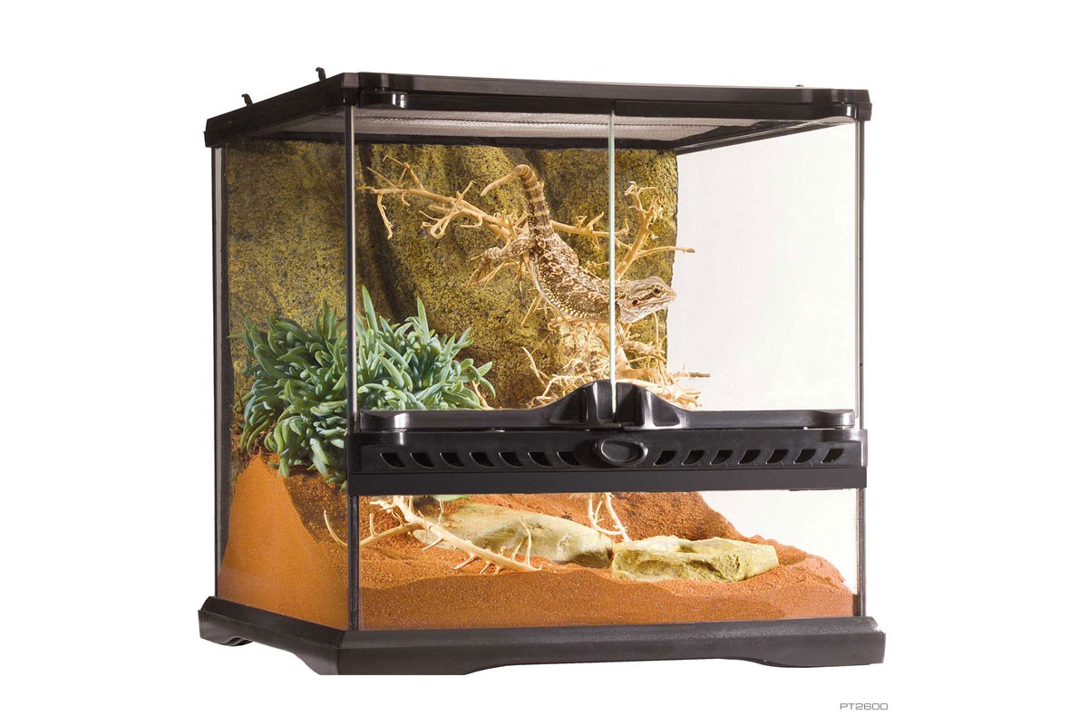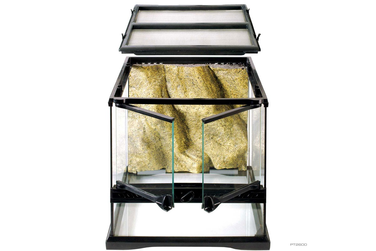 Az Exo Terra üveg terrárium az ideális hüllő- vagy kétéltűház, amelyet európai herpetológusok terveztek. Az elülső nyíló ajtók könnyű hozzáférést biztosítanak karbantartás és etetés céljából. Egy speciálisan kialakított zár megakadályozza a szökést, az ajtók pedig külön-külön is nyithatók. A teljes szúnyoghálós felső szellőzés lehetővé teszi az UVB és infravörös sugarak áthatolását, és teljesen levehető a könnyű hozzáférés érdekében dekoráció vagy tisztítás közben. A szúnyogháló hátulján mindkét oldalon 5 zárható vezeték- vagy csőbemenet található, amelyekkel hőhullám-köveket, vízeséseket, érzékelőket stb. lehet elhelyezni a terrárium belsejében. A terrárium alsó lapja meg van emelve, hogy egy aljzatfűtőt lehessen felszerelni a kiterjesztett talajfelület egy részének melegítésére. Az extra magas, fix elülső ablak ideális vastag aljzatrétegekhez (üregi hüllők), vízi élőhelyekhez (paludárium) vagy egy Exo Terra hüllőodú felszereléséhez. A természetes háttér színe megegyezik sok más Exo Terra dekorációs elem színével (víztálak, vízesések, hőhullám-kövek stb.), és extra mászóhatást biztosít.