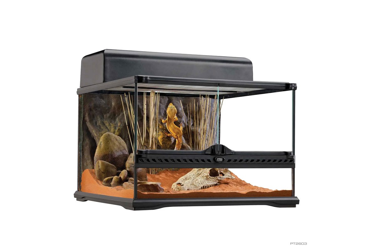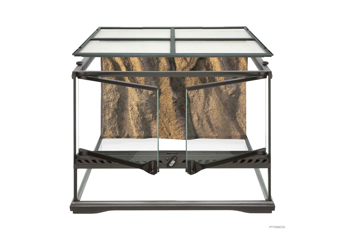 Az Exo Terra üveg terrárium az ideális hüllő- vagy kétéltűház, amelyet európai herpetológusok terveztek. Az elülső nyíló ajtók könnyű hozzáférést biztosítanak karbantartás és etetés céljából. Egy speciálisan kialakított zár megakadályozza a szökést, az ajtók pedig külön-külön is nyithatók. A teljes szúnyoghálós felső szellőzés lehetővé teszi az UVB és infravörös sugarak áthatolását, és teljesen levehető a könnyű hozzáférés érdekében dekoráció vagy tisztítás közben. A szúnyogháló hátulján mindkét oldalon 5 zárható vezeték- vagy csőbemenet található, amelyekkel hőhullám-köveket, vízeséseket, érzékelőket stb. lehet elhelyezni a terrárium belsejében. A terrárium alsó lapja meg van emelve, hogy egy aljzatfűtőt lehessen felszerelni a kiterjesztett talajfelület egy részének melegítésére. Az extra magas, fix elülső ablak ideális vastag aljzatrétegekhez (üregi hüllők), vízi élőhelyekhez (paludárium) vagy egy Exo Terra hüllőodú felszereléséhez. A természetes háttér színe megegyezik sok más Exo Terra dekorációs elem színével (víztálak, vízesések, hőhullám-kövek stb.), és extra mászóhatást biztosít.