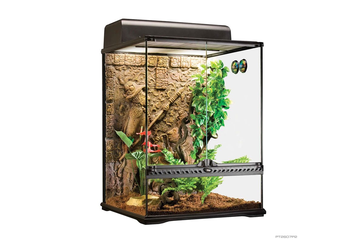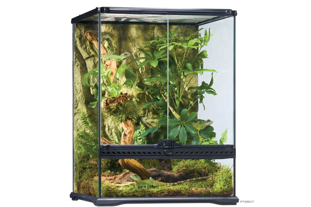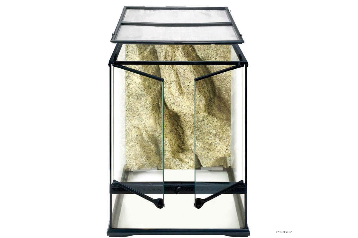 Az Exo Terra üveg terrárium az ideális hüllő- vagy kétéltűház, amelyet európai herpetológusok terveztek. Az elülső nyíló ajtók könnyű hozzáférést biztosítanak karbantartás és etetés céljából. Egy speciálisan kialakított zár megakadályozza a szökést, az ajtók pedig külön-külön is nyithatók. A teljes szúnyoghálós felső szellőzés lehetővé teszi az UVB és infravörös sugarak áthatolását, és teljesen levehető a könnyű hozzáférés érdekében dekoráció vagy tisztítás közben. A szúnyogháló hátulján mindkét oldalon 5 zárható vezeték- vagy csőbemenet található, amelyekkel hőhullám-köveket, vízeséseket, érzékelőket stb. lehet elhelyezni a terrárium belsejében. A terrárium alsó lapja meg van emelve, hogy egy aljzatfűtőt lehessen felszerelni a kiterjesztett talajfelület egy részének melegítésére. Az extra magas, fix elülső ablak ideális vastag aljzatrétegekhez (üregi hüllők), vízi élőhelyekhez (paludárium) vagy egy Exo Terra hüllőodú felszereléséhez. A természetes háttér színe megegyezik sok más Exo Terra dekorációs elem színével (víztálak, vízesések, hőhullám-kövek stb.), és extra mászóhatást biztosít.