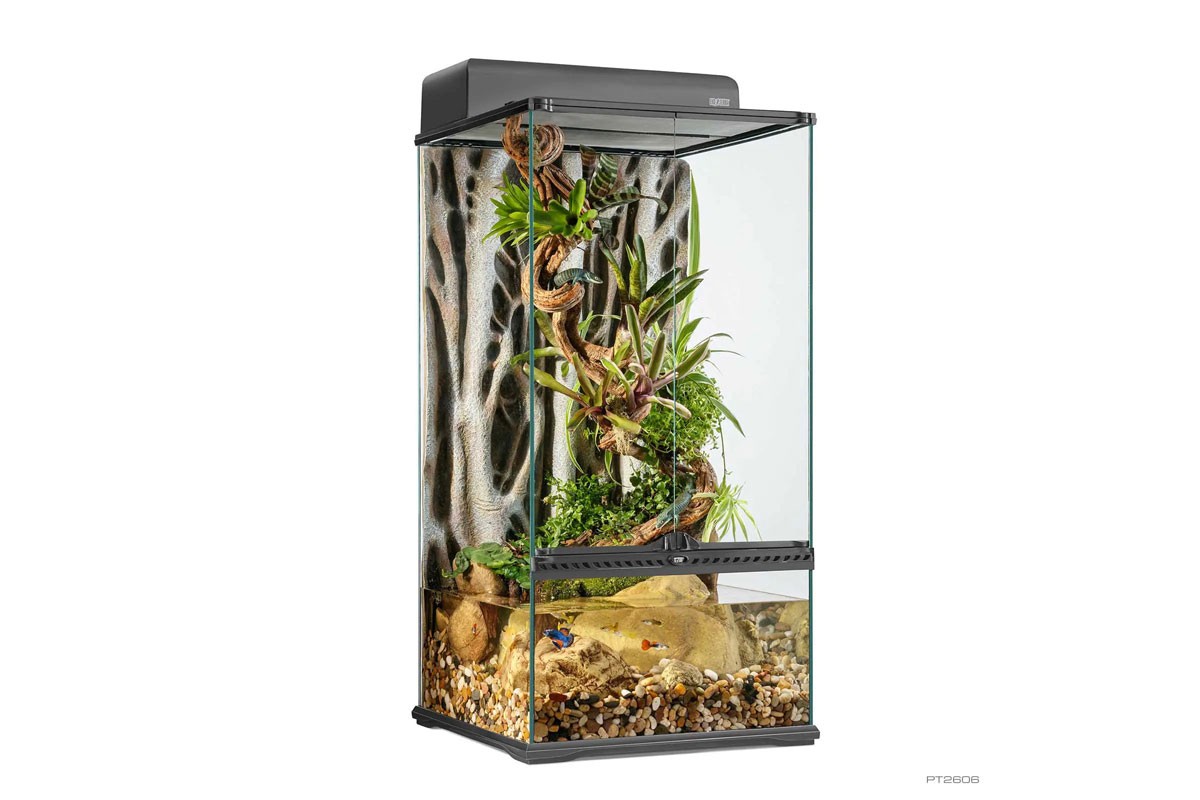 Terrárium találkozik az akváriummal: Az Exo Terra Paludarium egy félig vízi terráriumi élőhely, amely egy esőerdőt, mocsarat vagy patakot imitál, és vízi, valamint szárazföldi állat- és növényfajoknak is otthont ad. A paludárium két világ legjavát ötvözi: az alsó rész extra magas elülső alsó üveggel rendelkezik, amely magasabb vízszintet és nagyobb vízmennyiséget biztosít a hagyományos terráriumokhoz képest.