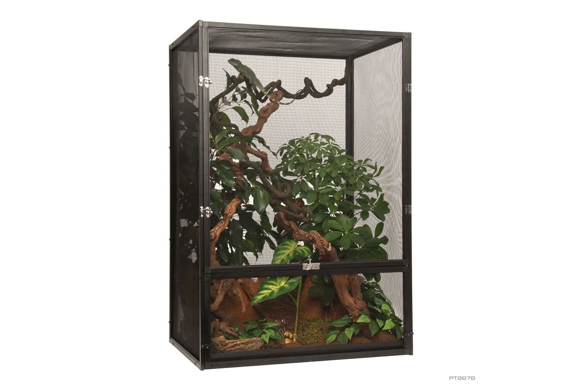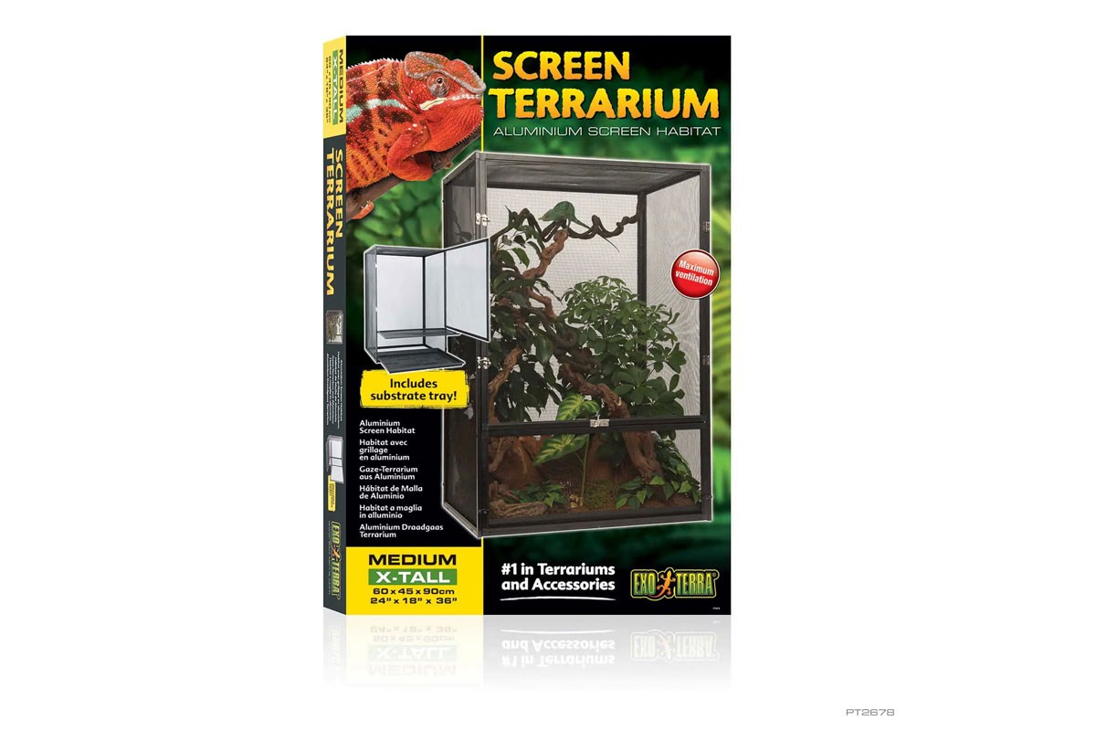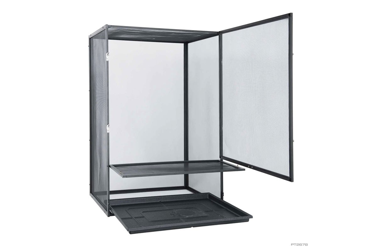 Az Exo Terra terrárium szúnyogháló tökéletes élőhely a fán élő hüllők és kétéltűek számára, amelyek érzékenyek a pangó levegőre. A korlátlan légáramlás optimális szellőzést biztosít, miközben minimalizálja a szagokat és a gombásodást a hüllők élőhelyén. A szúnyogháló kialakítása szélesebb hőmérsékleti gradienst biztosít, ami segít a hüllőknek hatékonyabban szabályozni testhőmérsékletüket, és megakadályozza a túlmelegedést. Az alumínium szúnyogháló lehetővé teszi, hogy az UVB fényből vagy a napból származó ultraibolya sugarak mélyen behatoljanak a terrárium belsejébe. A szubsztrát tálca lehetővé teszi, hogy egy kis szubsztrátréteget helyezzen a permetező víz elnyelésére és a páratartalom növelésére. Az aljzattálca könnyen eltávolítható a terráriumból az alsó, forgóajtón keresztül. A masszív, nikkelezett zárak stabilitást biztosítanak a terráriumnak, és biztonságban tartják a hüllőket.