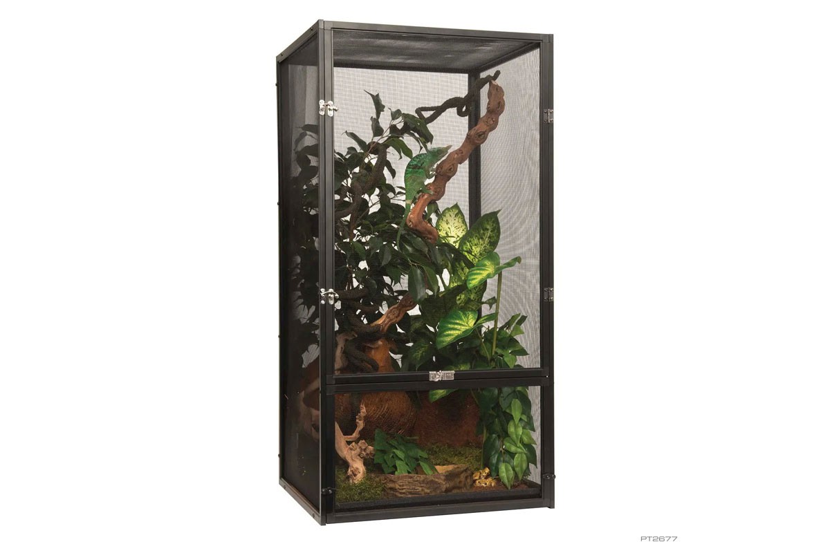 Az Exo Terra terrárium szúnyogháló tökéletes élőhely a fán élő hüllők és kétéltűek számára, amelyek érzékenyek a pangó levegőre. A korlátlan légáramlás optimális szellőzést biztosít, miközben minimalizálja a szagokat és a gombásodást a hüllők élőhelyén. A szúnyogháló kialakítása szélesebb hőmérsékleti gradienst biztosít, ami segít a hüllőknek hatékonyabban szabályozni testhőmérsékletüket, és megakadályozza a túlmelegedést. Az alumínium szúnyogháló lehetővé teszi, hogy az UVB fényből vagy a napból származó ultraibolya sugarak mélyen behatoljanak a terrárium belsejébe. A szubsztrát tálca lehetővé teszi, hogy egy kis szubsztrátréteget helyezzen a permetező víz elnyelésére és a páratartalom növelésére. Az aljzattálca könnyen eltávolítható a terráriumból az alsó, forgóajtón keresztül. A masszív, nikkelezett zárak stabilitást biztosítanak a terráriumnak, és biztonságban tartják a hüllőket.