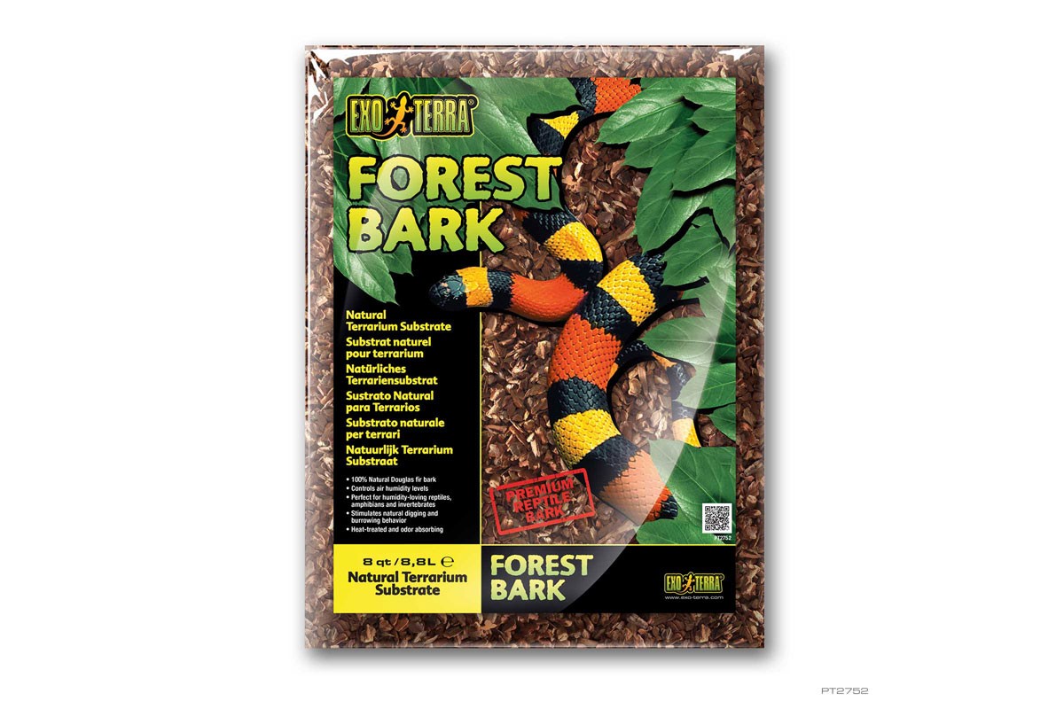 Az Exo Terra® Forest Bark egy 100% természetes, biológiailag lebontható hüllő aljzat, amely fenntartható fa kérgéből készül. A Forest Bark ideális dekoratív aljzat a trópusi és erdei környezetből származó, nedvességet kedvelő hüllők, kétéltűek és gerinctelen állatok számára. Higroszkópos tulajdonságai természetes módon szabályozzák a terrárium páratartalmát azáltal, hogy felszívják és lassan bocsátják ki a nedvességet. A kéregdarabok egyedi mérete és alakja ösztönzi a természetes ásási és túrási viselkedést, és megakadályozza, hogy a tücskök elrejtőzzenek az aljzatban. A fenyőkéreg alaposan átmosásra kerül, hogy a kéregdarabok simábbá váljanak és a por eltávolításra kerüljön, majd hőkezelt, hogy csökkenjen a bakteriális szennyeződés.
