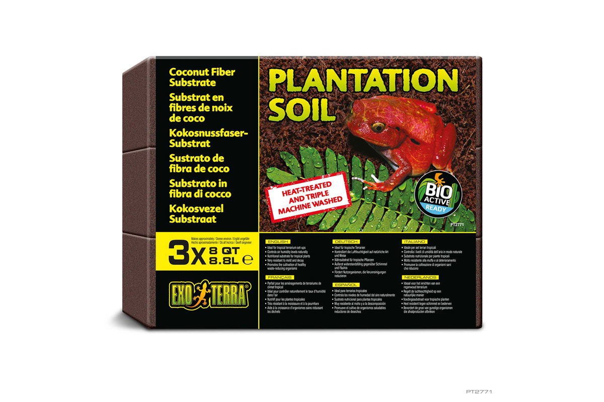 Az Exo Terra ültetvényföld ideális talaj trópusi terráriumok kialakításához a páratartalmat kedvelő hüllők, kétéltűek és gerinctelenek számára. Az Exo Terra ültetőföldhöz használt egyedi kókuszrost bél rövid rostok és kókusz-tőzeg szemcsék keverékéből áll, amelyek mérete a durva szemcséktől a finom csomókig terjed, ami jobb talajvízelvezetést és levegőztetést eredményez. A talaj jobb levegőztetése elősegíti az egészséges hulladékcsökkentő organizmusok szaporodását, így terráriuma friss és tiszta marad.
