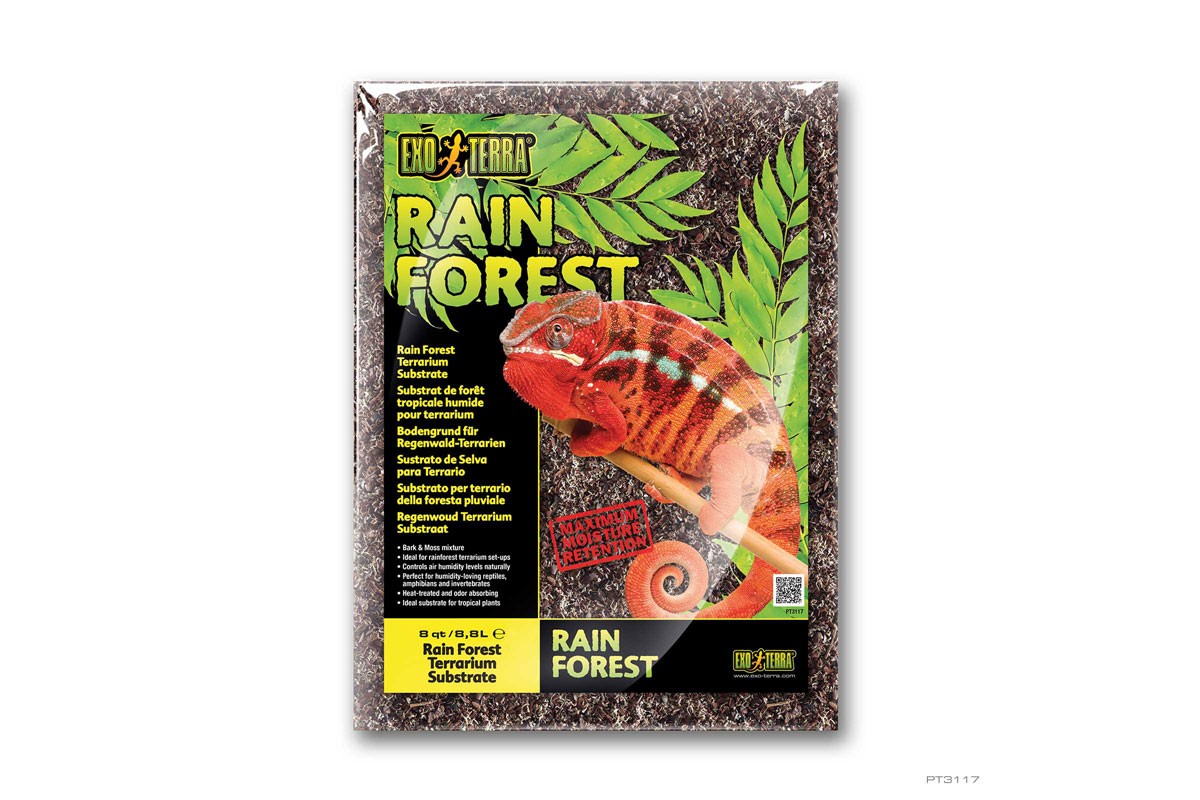Az Exo Terra® Rain Forest egy 100%-ban természetes, biológiailag lebomló hüllő talaj keverék, amely fenntartható tengerparti fenyőből és tőzegmohából készült. Az esőerdő terrárium talaj ideális dekoratív talaj természetes növényekkel beültetett terrárium kialakításához a trópusi esőerdők környezetéből származó páratartalmat kedvelő hüllők, kétéltűek és gerinctelenek számára. Az esőerdő talaj természetes módon szabályozza a terrárium páratartalmát a nedvesség elnyelésével és lassú felszabadításával. Higroszkópos tulajdonságait a keverékhez természetes tőzegmoha hozzáadása maximalizálja. A megfelelő páratartalom elősegíti a szőrhullást és segít megelőzni a légúti fertőzéseket. A kéregrészecskék egyedi mérete és alakja, a természetes tőzegmohával kombinálva, lehetővé teszi a növények gyakori öntözését, miközben jó szellőzést biztosít az egészséges gyökérnövekedéshez. Az Exo Terra® Rain Forest hőkezelt a bakteriális szennyeződés csökkentése érdekében.