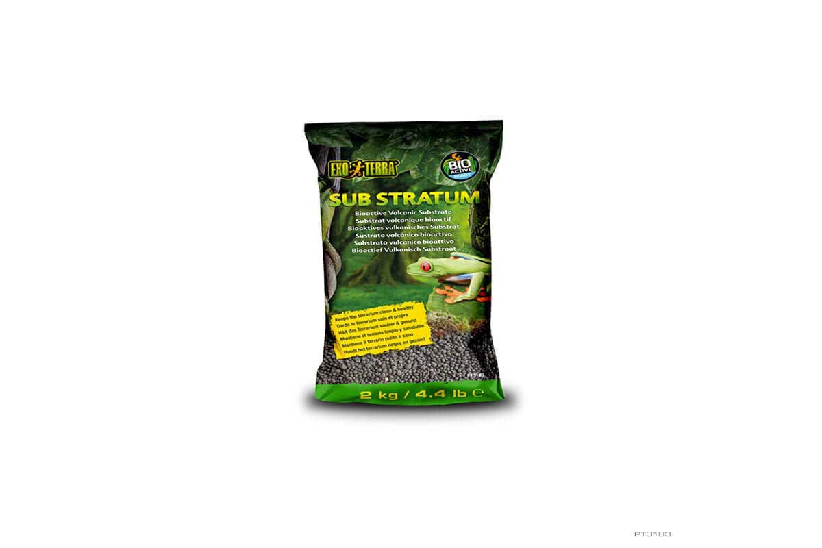 Az Exo Terra Sub Stratumot a japán Aso vulkán ásványi anyagokban gazdag lábainál gyűjtik. Az andezit és riolit tefra alkotta természetes vulkáni talaj nagyon tápanyagban gazdag, ideális a bioaktív növényes terráriumokban a buja növényzet növekedéséhez. A porózus felület kiváló vízelvezetést és levegőztetést biztosít, elősegítve az erős gyökérnövekedést. A Sub Stratum porózus, alacsony sűrűségű szerkezete elősegíti a hasznos, nitrifikáló baktériumok virágzó populációját, létrehozva egy önfenntartó, élő terrárium ökoszisztémát. A talaj aktív, hasznos baktériumai lebontják a biológiai hulladékokat, így a terrárium tiszta és egészséges marad.