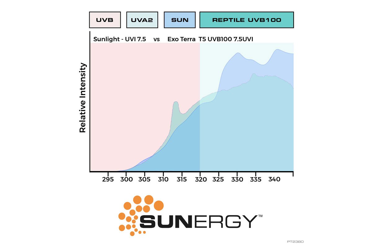 Az innovatív Sunergy™ foszforkeverék teszi egyedivé az Exo Terra Reptile UVB T5 lámpáit. A Sunergy™ egy csúcstechnológiájú foszforkeverék, amelyet német precíziós technológiával fejlesztettek ki a nap energiaspektrumának, különösen az UV tartománynak a reprodukálására. Ez a csúcstechnológiájú keverék közelebb áll a természetes napfényhez, mint bármely más, a piacon kapható lámpa, és úgy tervezték, hogy megfeleljen a legmagasabb szabványoknak, páratlan minőséget és teljesítményt nyújtva. A Sunergy™ segítségével az Exo Terra Reptile UVB T5 lámpák biztosítják a hüllők számára az egészségükhöz, vitalitásukhoz és természetes viselkedésükhöz szükséges UVB-sugárzást.
