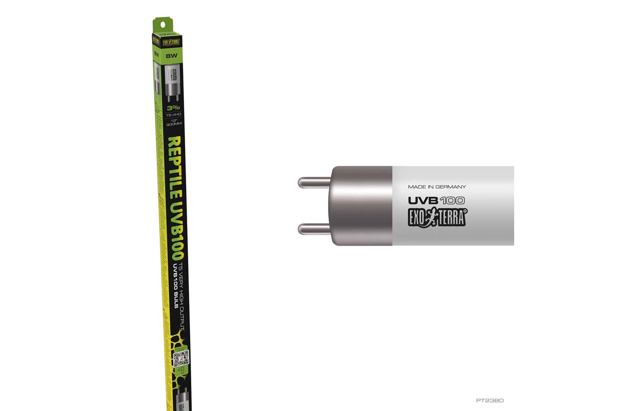 Az Exo Terra® Reptile UVB100 VHO T5 izzó elősegíti az egészséges D3-vitamin szintézist, ami viszont javítja a kalcium felszívódását – védve a metabolikus csontbetegségek ellen. UVA- és UVB-sugárzása meghaladja a hagyományos T8 izzók és az energiahatékony alternatívákét, míg a jobb UVB-áteresztő képessége alkalmassá teszi magasabb terráriumokban vagy sűrűbb szitákkal felszerelt terráriumokban való használatra.