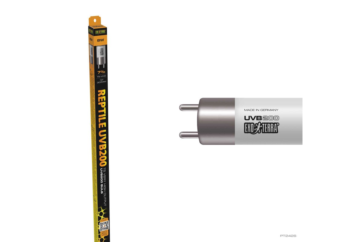 Az Exo Terra® Reptile UVB200 VHO T5 izzó elősegíti az egészséges D3-vitamin szintézist, ami viszont javítja a kalcium felszívódását – védve a metabolikus csontbetegség ellen. UVA- és UVB-sugárzása meghaladja a hagyományos T8 izzók és az energiahatékony alternatívákét, míg a jobb UVB-áteresztő képessége alkalmassá teszi magasabb terráriumokban vagy sűrűbb szitákkal felszerelt terráriumokban való használatra.