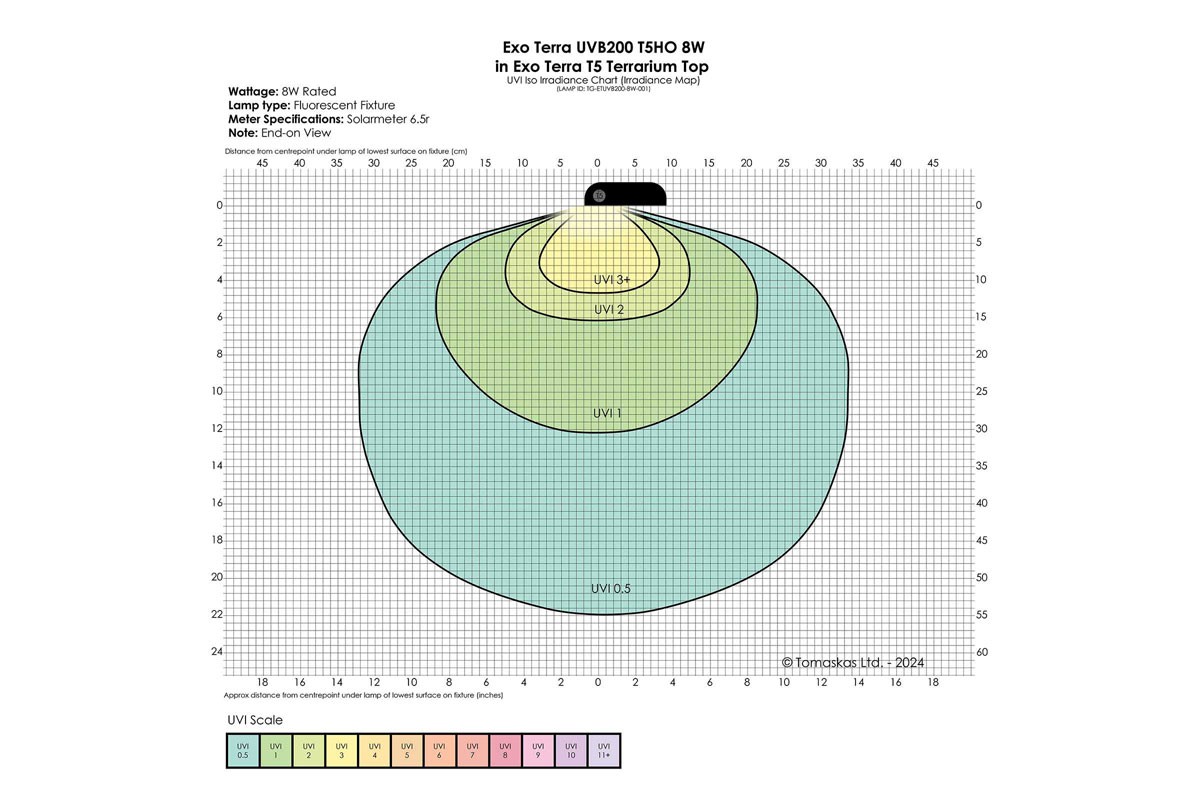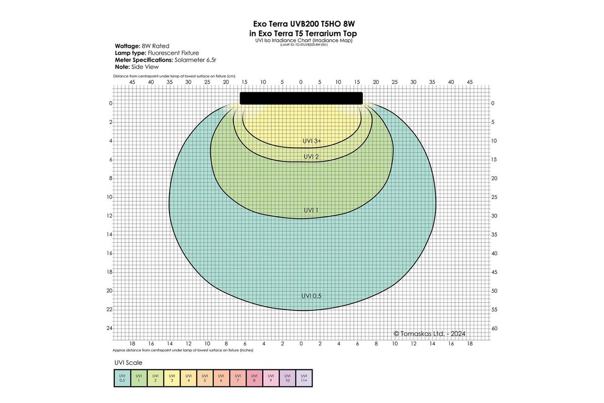 Az Exo Terra Reptile UVB200 közepes szintű UVB-sugárzást biztosít, amelynek célja a félig árnyékos vagy részben napos élőhelyek feltételeinek utánozása. Ezek a környezetek jellemzőek az alkalmanként napozó vagy idejük egy részét közvetlen napfényben töltő hüllőkre.