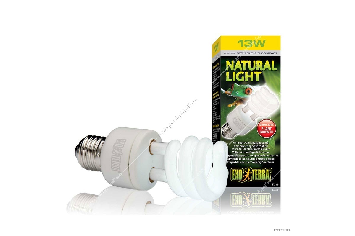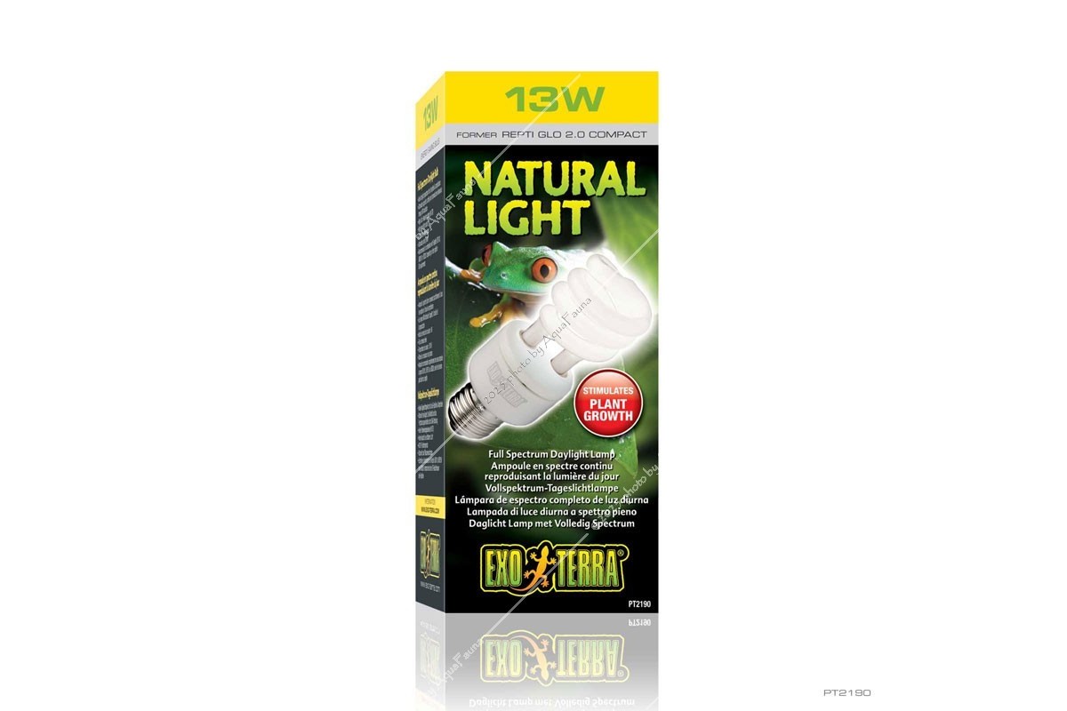 Az Exo Terra Natural Light egy teljes spektrumú nappali fényű lámpa, amely nagyon magas vizuális fénykibocsátással és magas színvisszaadási indexszel (98 CRI) rendelkezik. Magas vizuális fénykibocsátásával és 6700 K színhőmérsékletével a Natural Light terráriumlámpa általános fényforrásként ajánlott minden terráriumtípushoz. A nagy fénykibocsátás miatt ez az izzó alkalmas ültetett terráriumokhoz, és ideális az alacsonyabb UV-igényű állatok, például kígyók, kétéltűek (békák, varangyok és szalamandrák) és éjszakai állatok számára.