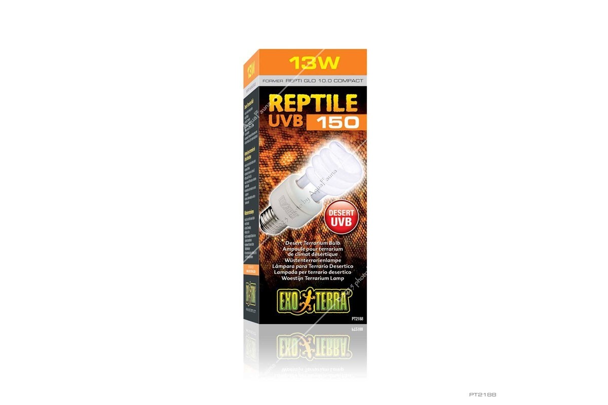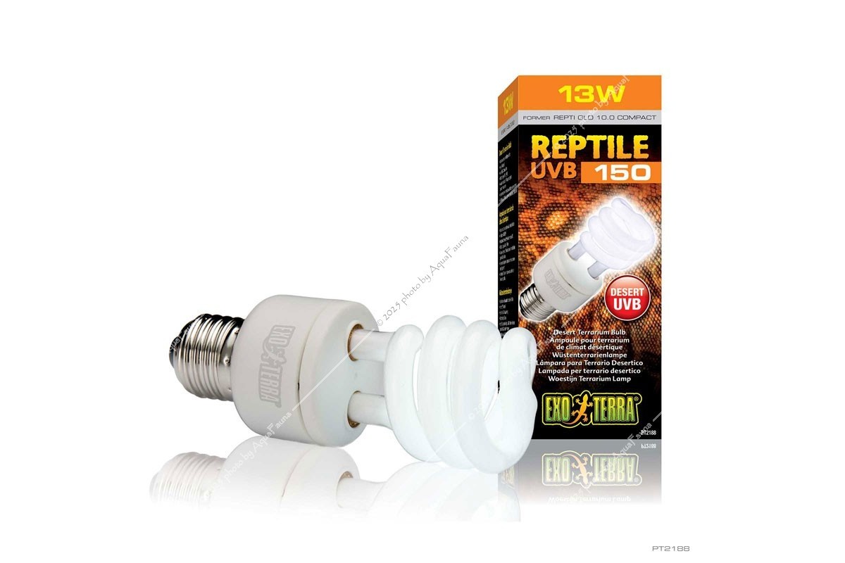 Az Exo Terra Reptile UVB150 nagyon magas UVB kimenettel rendelkezik, hasonlóan a sivatagi napfényhez. Ezek a helyek több közvetlen napfényt kapnak, ezért a sivatagi hüllők jobban ki vannak téve az UV-sugárzásnak, mint bármely más hüllőfaj. Ez az izzó sűrűbb árnyékolóval ellátott terráriumokban is használható a megfelelő UVB behatolás biztosítása érdekében. A sűrű képernyők az UVB-sugarak akár 50%-át is kiszűrhetik. A magas D3-vitamin hozamindex biztosítja a D3-vitamin fotoszintézist a kalcium felszívódásának elősegítése és az anyagcsere-betegségek megelőzése érdekében.