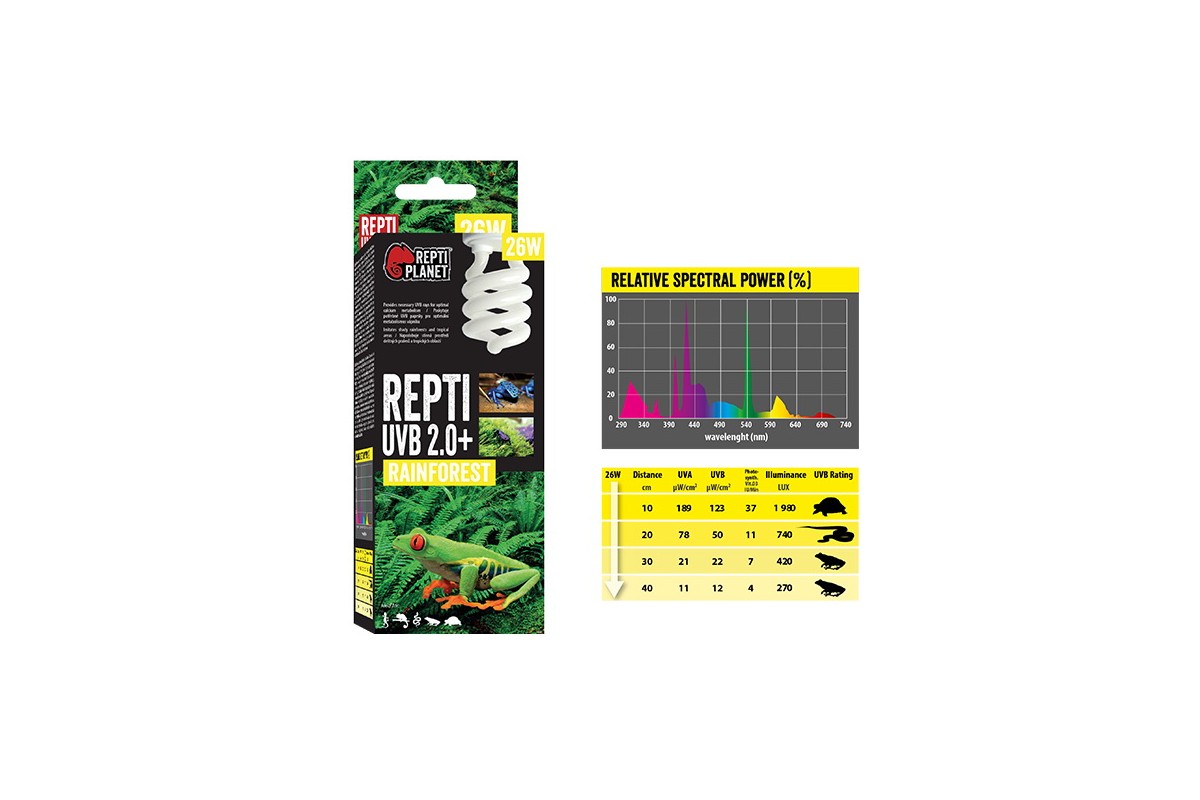 A REPTI PLANET UVB 2.0+ nem bocsát ki elegendő hőt és fényt. Szükség esetén kombinálja fűtő- és világító lámpákkal (például Repti Planet Infrared Heat, Daylight Basking Spot, Daylight Frosted, Daylight Neodymium, Far Infrared Heat vagy Night Heat). Az optimális UVB-sugárzás intenzitása segít a D3-vitamin átalakulásában, ami biztosítja a kalcium felszívódását. Az UVB-sugárzás a napfény része, amely fontos a terráriumban tartott állatok egészségének megőrzéséhez és az anyagcsere-betegségek megelőzéséhez. Az izzók UVB-sugárzásának intenzitása használat közben csökken (1 év alatt több mint 50%). A rendszeres cserével biztosítható az optimális UVB-intenzitás. Az izzó kiválasztásakor nemcsak az UVB-izzó típusát kell figyelembe venni, hanem a tenyésztett állat faját és az állat távolságát az UVB-sugárzás forrásától is.